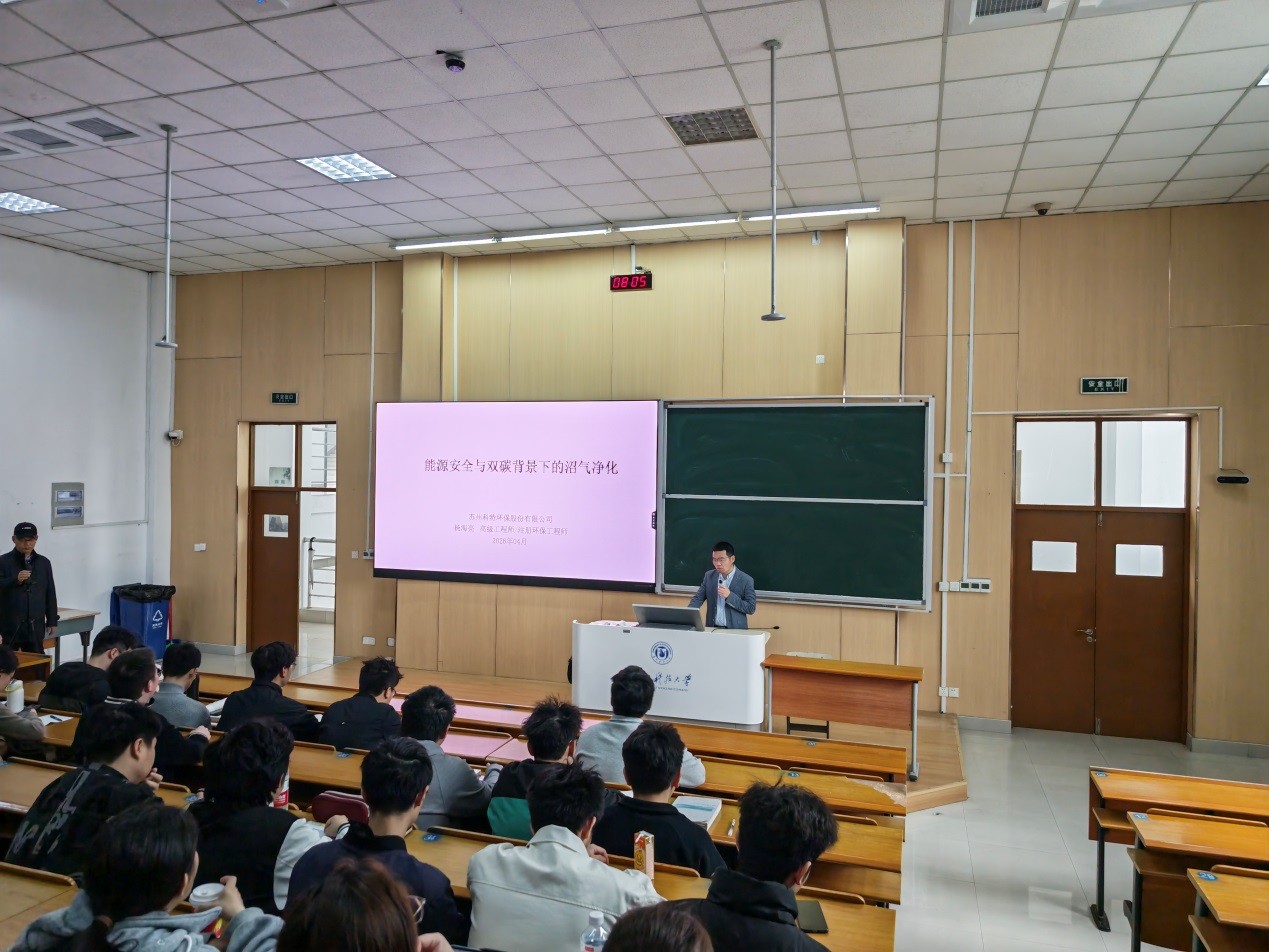 优秀校友杨海亮高级工程师走进《大气污染控制工程》课程,在石湖校区C5-201为环境工程专业23级的百余学生带来题为《能源安全与双碳背景下的沼气净化技术》的专题授课。